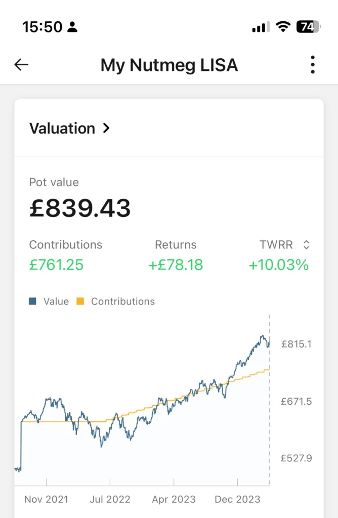 The accounts have varied in their performance. Both Nutmeg accounts have had a positive return; 10% in the case of my Lifetime ISA (and that’s on top of the 25% government contribution). However, there have been times where the value of my investments has been less than my contributions – the start of the war in Ukraine, for example. It’s only really been in the last 6 months that I have had a consistently positive return, and there’s been a wobble in recent weeks.