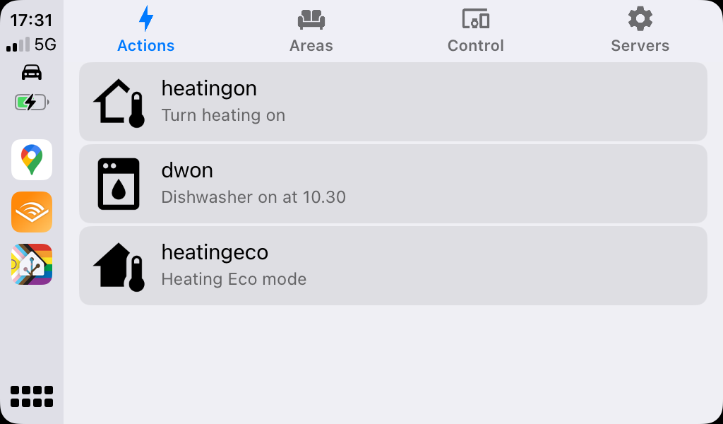 The Home Assistant app has four tabs: Actions, Areas, Control and Servers. Areas gives you the list of rooms that you have defined, and from there you can access some of your devices. Control gives you a big list of all of the devices that have a function that can be controlled whilst using CarPlay – mainly buttons and switches. Meanwhile the Servers tab is there in case you’re able to log in to more than one Home Assistant instance.