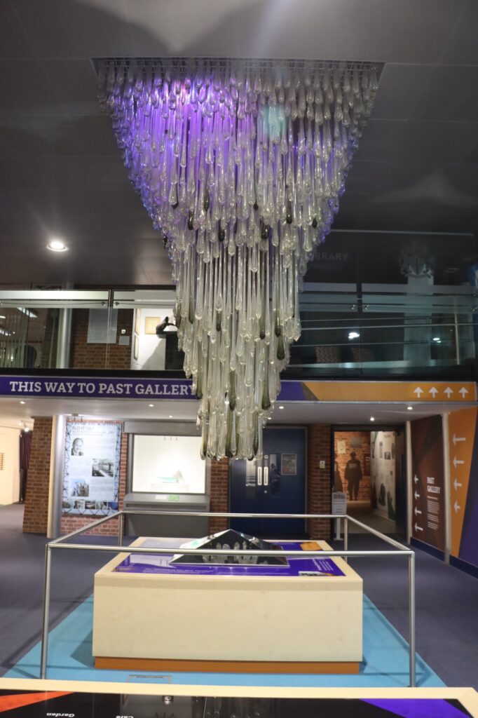 Though this is its 25th year, it’s clearly had some updates to its exhibits since then. I think it manages to strike a good balance between things in glass cabinets, and interactive exhibits to keep kids entertained. Certainly, our nine-year-old enjoyed learning about fibre-optic communications, and the various light and colour mixing activities. Its star attraction is a chandelier that was salvaged from Manchester Airport during a refurbishment, made of hundreds of hand-blown Venetian glass tubes.