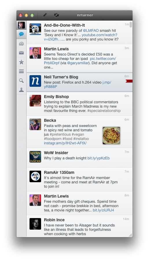 Until recently this was my favoured Twitter client on my Mac, but having used Tweetbot on my iPhone for some time I felt that I wanted a more powerful desktop Twitter client too. Osfoora had just been launched, so I gave it a spin, and I have to say I’m impressed.
